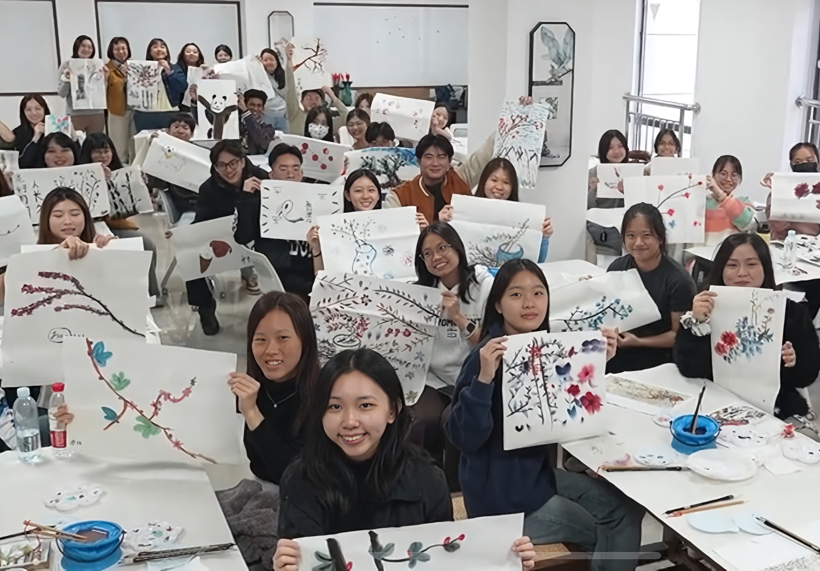 学生们听完后跃跃欲试。不少学生临摹墙上展览的中国画,如熊猫、樱花、竹子、鲤鱼等。“我在画一只爬树的熊猫,很喜欢可爱的中国国宝。”新加坡义安理工学院学生Shasthi分享道。