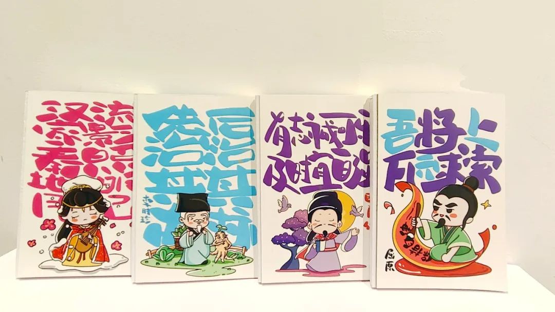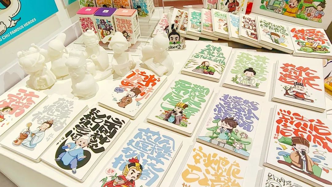 赛事现场,黄雨露作品展区,井然有序地摆放着一系列荆楚名贤的IP形象产品,其中不仅有陆羽、诸葛亮、王昭君等10人在内的Q版3D树脂人物模型,还有印染李白、嘉靖帝等人Q版形象的帆布袋3个、亚克力笔筒6个以及30位名贤均在内的记事本、亚克力笔......三维立体形象与二维Q版形象的交互使作品的类型多样,也增加了产品的丰富性。