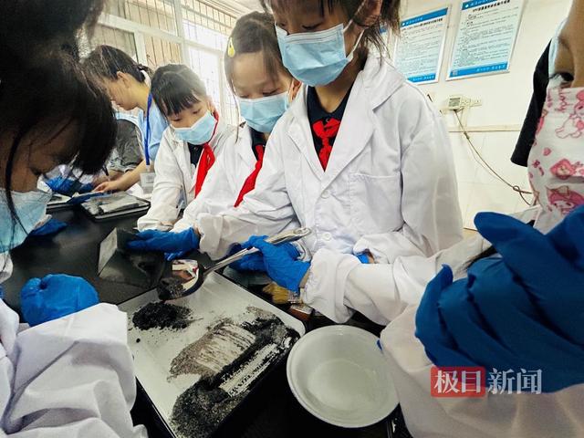 “把矿物都混在一起了,该怎么分开它们呢?”李梦晨同学提出了自己的疑问。“这个简单,科学课学了磁铁可以吸引铁,可以利用这个原理分离磁铁矿!”江奕乐同学说道。这个想法得到了研究生大哥哥的赞同,同学们将磁铁凑近磁铁矿,奇妙的现象发生了,磁铁矿粉竟然会“跳舞”,而赤铁矿粉则“跳舞”不明显,石英粉几乎是“无动于衷”。原来这磁铁矿是强磁性物质,赤铁矿是弱磁性物质,石英粉几乎没有磁性。