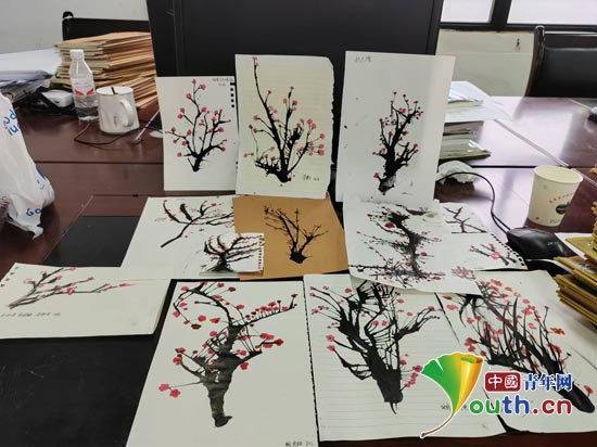 讲解结束后,学生们迫不及待地将墨汁滴到纸上,用吸管或笔筒等工具将墨汁吹出梅花的枝干,然后用红色彩笔、粉笔等点上梅花花瓣,一株株形态各异的梅花树跃然纸上。(记者 李彦龙 通讯员 徐继男)