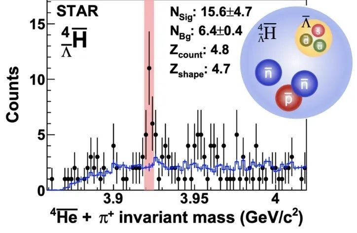 实验组分析了约66亿次重离子对撞事件的实验数据,识别出大约16个反超氢-4核,它由一个反质子、两个反中子和一个反lambda超子组成,是目前实验上发现的最重的反物质超核。