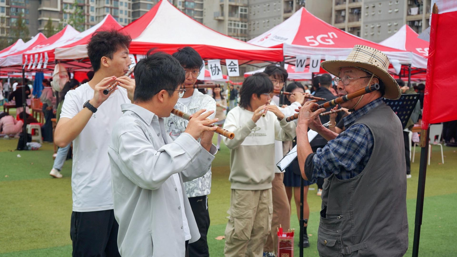 笛箫艺术协会指导教师瞿同庆已年近八旬,亲临招新现场与社团成员共同演奏曲目,想用音乐吸引学生们报名社团。该校2012级毕业生王明元和来自武汉东湖学院的笛箫爱好者也被邀请到了现场,一曲演奏完毕,现场响起了热烈的掌声。协会负责人江海慧说:“我们十分欢迎零基础的同学加入我们!”
