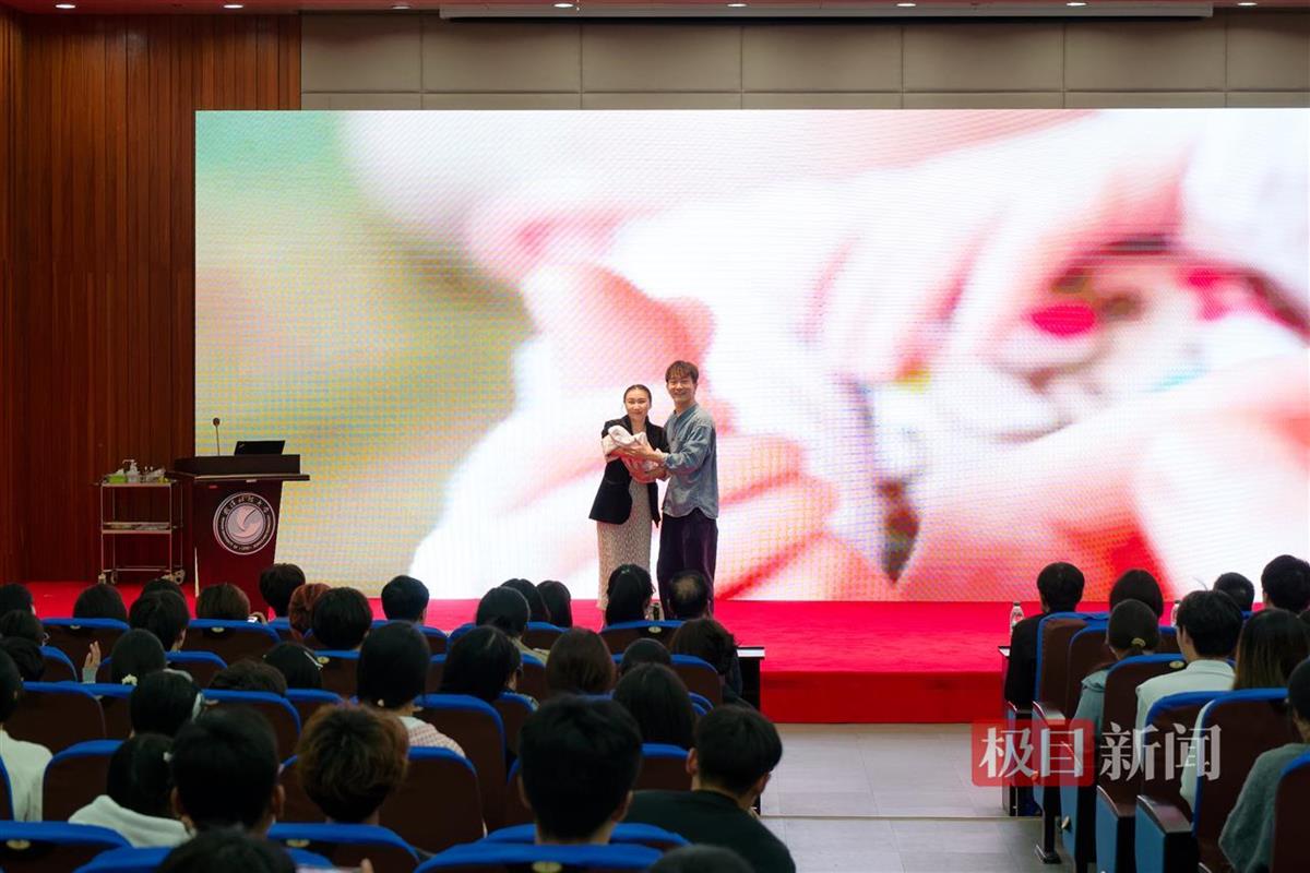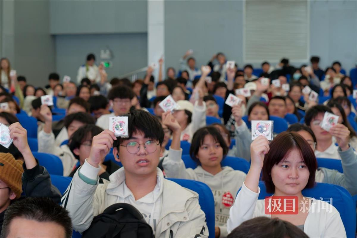 随着一段关于无偿献血街头随机采访的播出,情景剧《血型宝贝》闪亮登场,“A”“B”“O”“AB”四种血型“变身”血型宝宝,逐一揭开了血型背后的秘密。《让我留在你身边》则聚焦一对年轻夫妻,生动再现了普通人从不理解无偿献血到被无偿献血者感动的心态转变。演讲《一张永不褪色的献血证》以献血200余次的“兵哥哥”宗晓斌为原型,娓娓道出了他从一名普通士兵到“热血先锋”的故事。武汉血液中心无偿献血科普达人王丹则巧妙地将关于输血、血液的一个个科普知识点穿插演绎,同时也普及了“无偿献血者优先用血” “四免优待政策”等无偿献血政策,客观准确地解答了大家对于献血的常见疑惑。活动快要结束时,同学们收到了意外的惊喜:原来每位同学的座位下都“藏着”一个“热血信物”——特别定制的“热血新青年”徽章,武汉血液中心期待同学们戴上“热血信物”献一次血,将爱心不断传递。