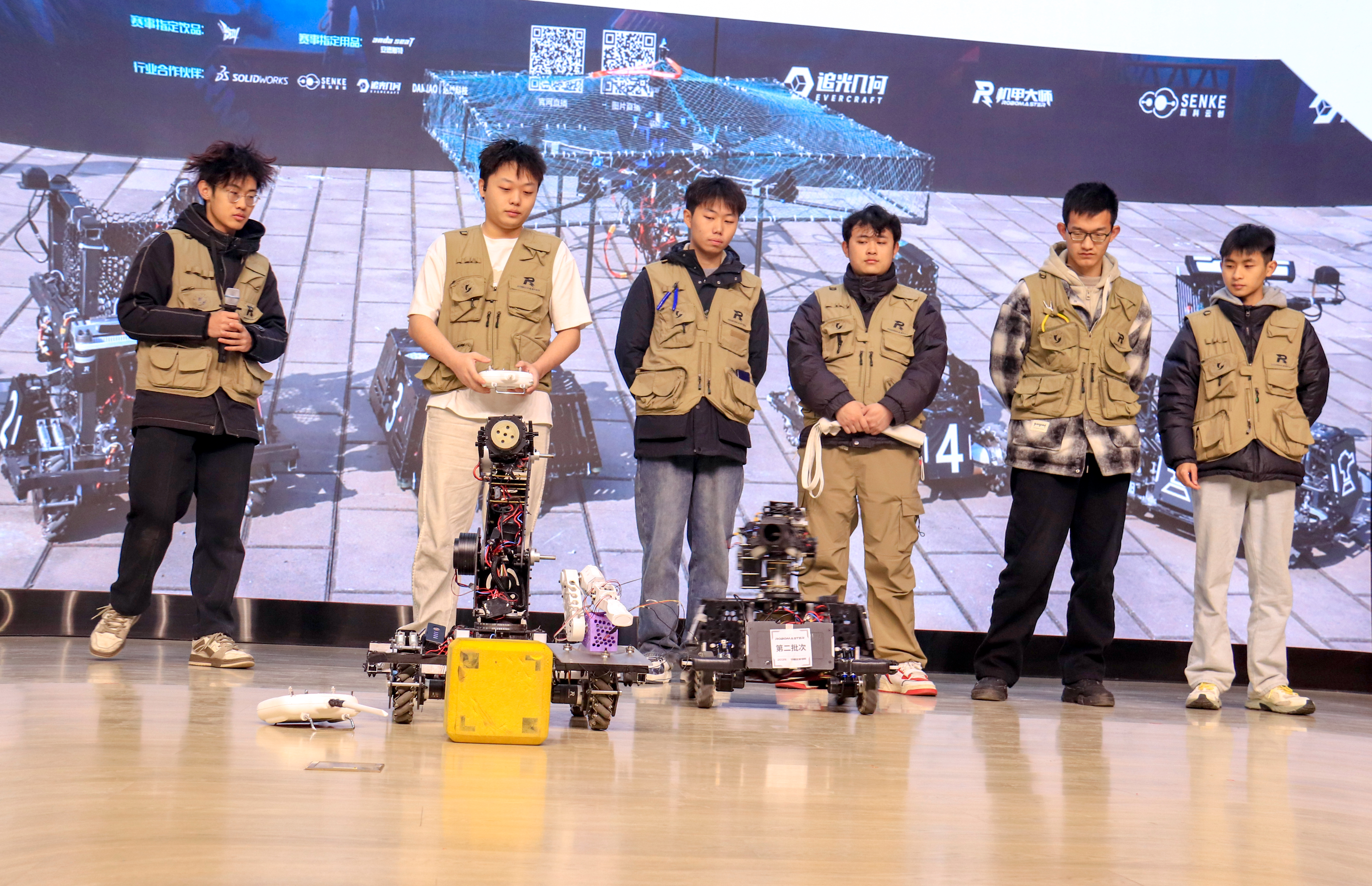 “机器人是如何像人一样抓取物体的?”“如何让机器人的‘胳膊’‘关节’运转起来?”战队成员周天浩将机器的各部分与人体的胳膊、皮肤类比起来,解释了“英雄”和“工程”机器人的运行逻辑。“机器的‘胳膊’可以调整机械臂的长度,机械的感知就跟人体皮肤的触觉一样,机器能够感受人体左手和右手合在一起的‘感觉’。”现场演示了机器人360度旋转、弹丸发射、直线运行等操作流程。107班学生王悠然在志愿者的引导下,缓慢拨起旋钮,机器人便轻盈着移动起来,引发在场学生阵阵惊呼。“真有趣!我在机器人课程上学习了相关内容,这次操作让我有进一步学习的动力!”他感叹道。