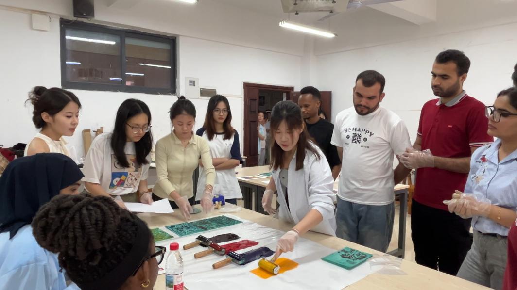 活动现场,传统工艺与现代教学理念深度融合,焕发勃勃生机。在武强木版年画拓印区,展现的是师生团队围绕“生肖·节气”主题,以高饱和度色彩碰撞简化造型,创作出的“大雪·冬至——鼠”“小寒·大寒——虎”等12组特色木刻版画。留学生在指导下,滚墨、铺纸、拓印,动作由生涩渐至娴熟。顷刻间,一幅幅色彩明快、寓意吉祥的年画跃然纸上。越南留学生BUI THI HAI YEN手持作品赞叹:“图案精巧灵动,色彩如此鲜亮夺目,中国年画的魅力超乎想象!”