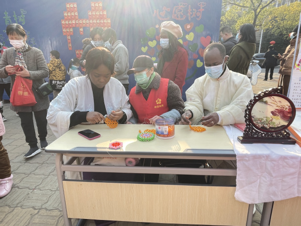 武科大网讯(通讯员王明玥)2月1日上午,在我校青山校区东苑小广场,元宵节喜乐会活动热闹开展。我校留学生们与国际学院的老师、科大社区居民和志愿者们一起体验穿汉服、品尝汤圆、串珠子制作杯垫、写心愿墙和套圈等活动,共同沉浸在元宵将至的氛围中。