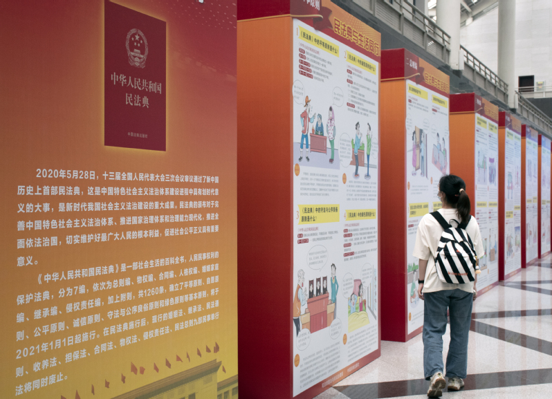 “与民法典同行”的普法展板立于会场两侧,我校学生记者赫欣怡被展板上的漫画吸引,驻足阅读。“展板上列举的法律条文都和我们的生活息息相关,上面的漫画也很生动形象,让我很快就理解了这些条文。”