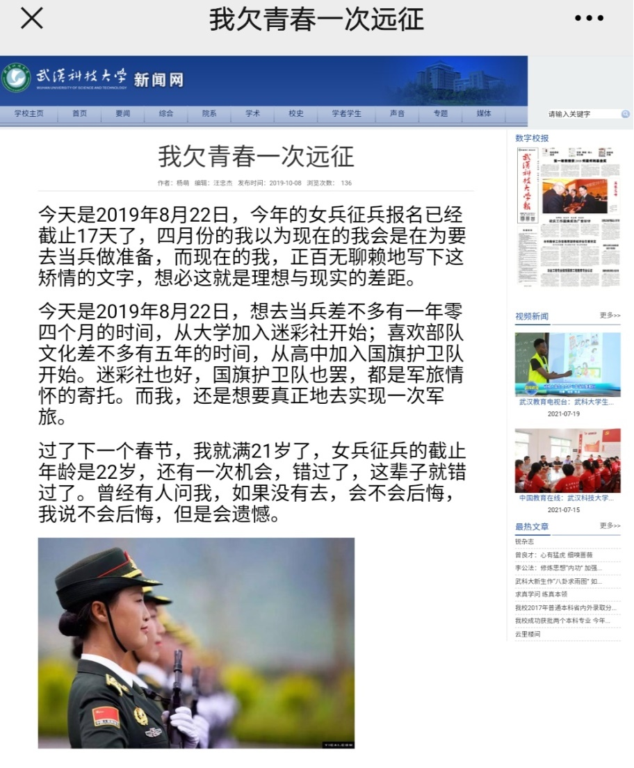 “今天是2019年8月22日,今年的女兵征兵报名已经截止17天了,四月份的我以为如今的我应该在为去当兵做准备,而现况是我正百无聊赖地写下这矫情的文字,想必这就是理想与现实的差距。”2019年的夏天,我将军旅梦藏于心中,以为自此与之无缘,用晦涩的语言将这份情怀付诸笔端,写下《我“欠”青春一次远征》。