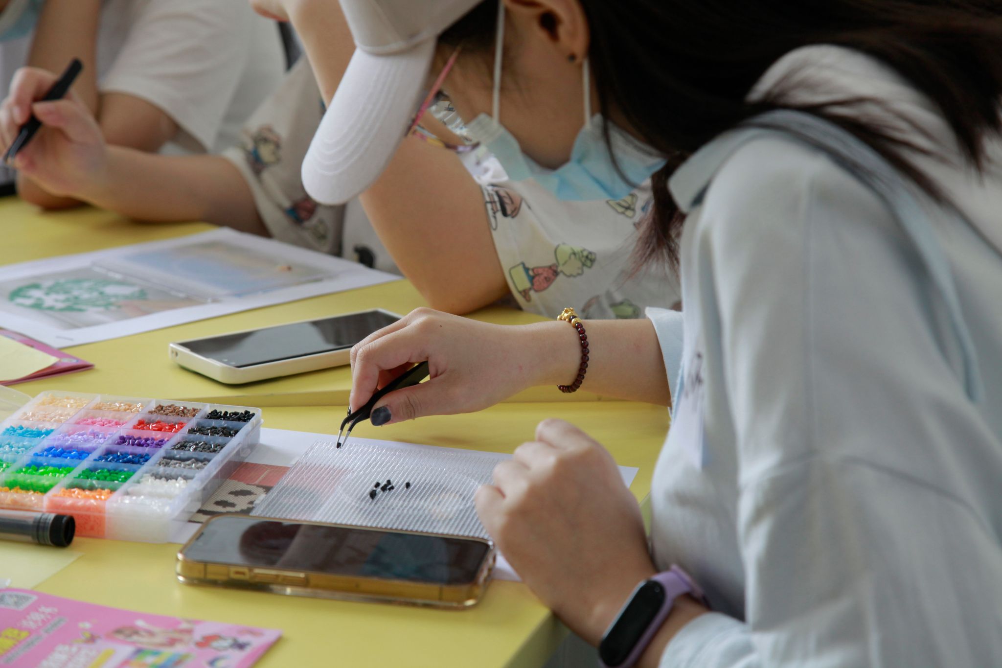 会心团辅室里,毕业生们用“拼豆豆”来DIY自己的毕业礼物。“希望你们都能把自己的理想拼出来!”活动带领老师薛春艳说道。学生们构思好自己的作品后便拿起了镊子,在模具上一粒一粒地拼起了豆豆。管理学院1902班学生吴国艳选择将我校校门作为自己的作品,她分享道:“毕业之后就要回家了,可能也不会回到武汉了,所以想拼一个学校,给自己一个留念。”