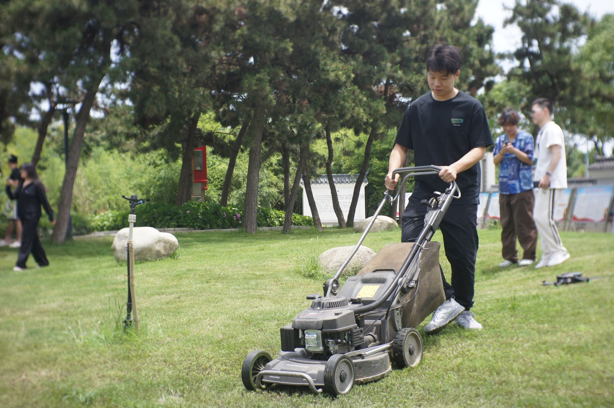 “拉动这里启动除草机,捏紧后把手,机器就往前走。”体育学院2023级学生张新元在后勤集团职工指导下,一把拉动油门线,伴随“嗡嗡”的轰鸣,开始控制除草机前行割草。一开始,除草机的路径歪歪扭扭,熟练后,他能够平稳地推动机器割完一整圈的草。“学生们的干劲很大!我们也不要落后!”我校信息科学与工程学院2022级辅导员潘鑫一边操纵机器,一边笑着说。
