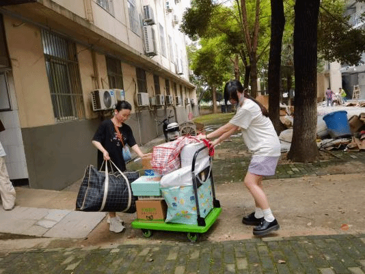 早晨,阳光洒在干净整洁的院内道路上,学生们忙碌而有序地打包着自己的行李,脸上洋溢着对新生活的期待和憧憬。佑安楼前,一辆辆搬运拖车来往穿梭,满载着学生们的物品,前往他们的新居。