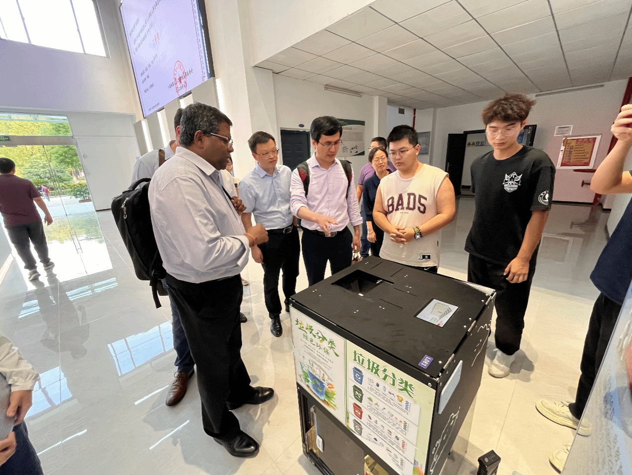 在一楼钢铁文化大厅,Bas Baskaran一行参观了中国大学生工程实践创新能力大赛、睿抗机器人开发者大赛(RAICOM)等学生竞赛获奖作品,获奖团队学生向Bas Baskaran一行介绍了智能分类垃圾桶、射击机器人、四足机器人等作品的创作思路、功能特性和创新元素,并就机器视觉、智能控制等核心技术与Bas Baskaran一行进行了探讨。当得知这些作品全部由学生自己动手设计、加工制作时,Bas Baskaran对学生的工程实践创新能力表示高度赞扬。