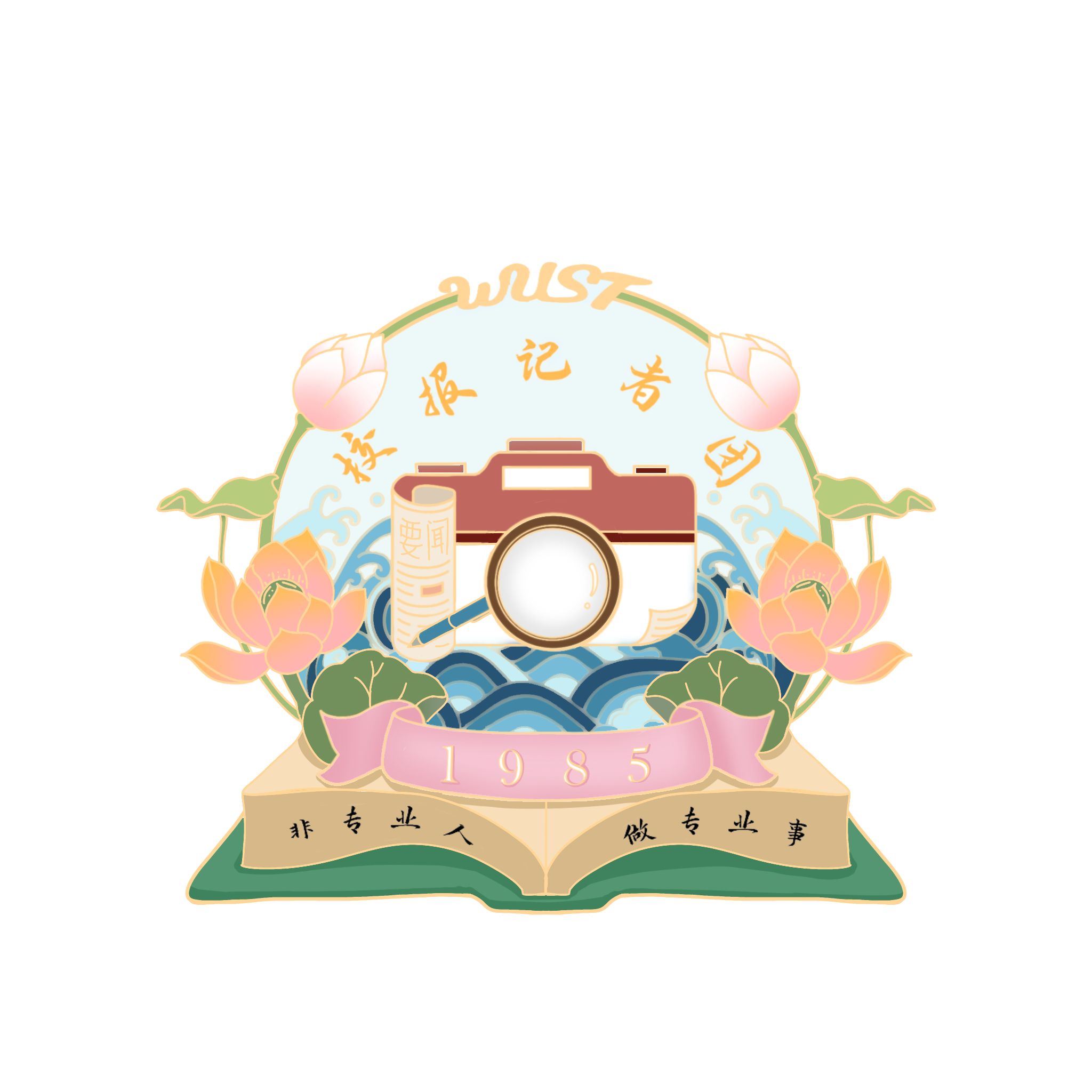 “当我把大致内容勾勒出来时发现,这些元素放在任何一个记者团的徽章上都行,没有我们学校的特色。”朱梦寒回忆道,于是她结合我校宏伟对称的主教楼,循四季各享风流的沁湖美景等特点,融合荷叶荷花,报纸卷轴,相机书本,以及我校记者团的口号“非专业人 做专业事”等元素创作出了此徽章。